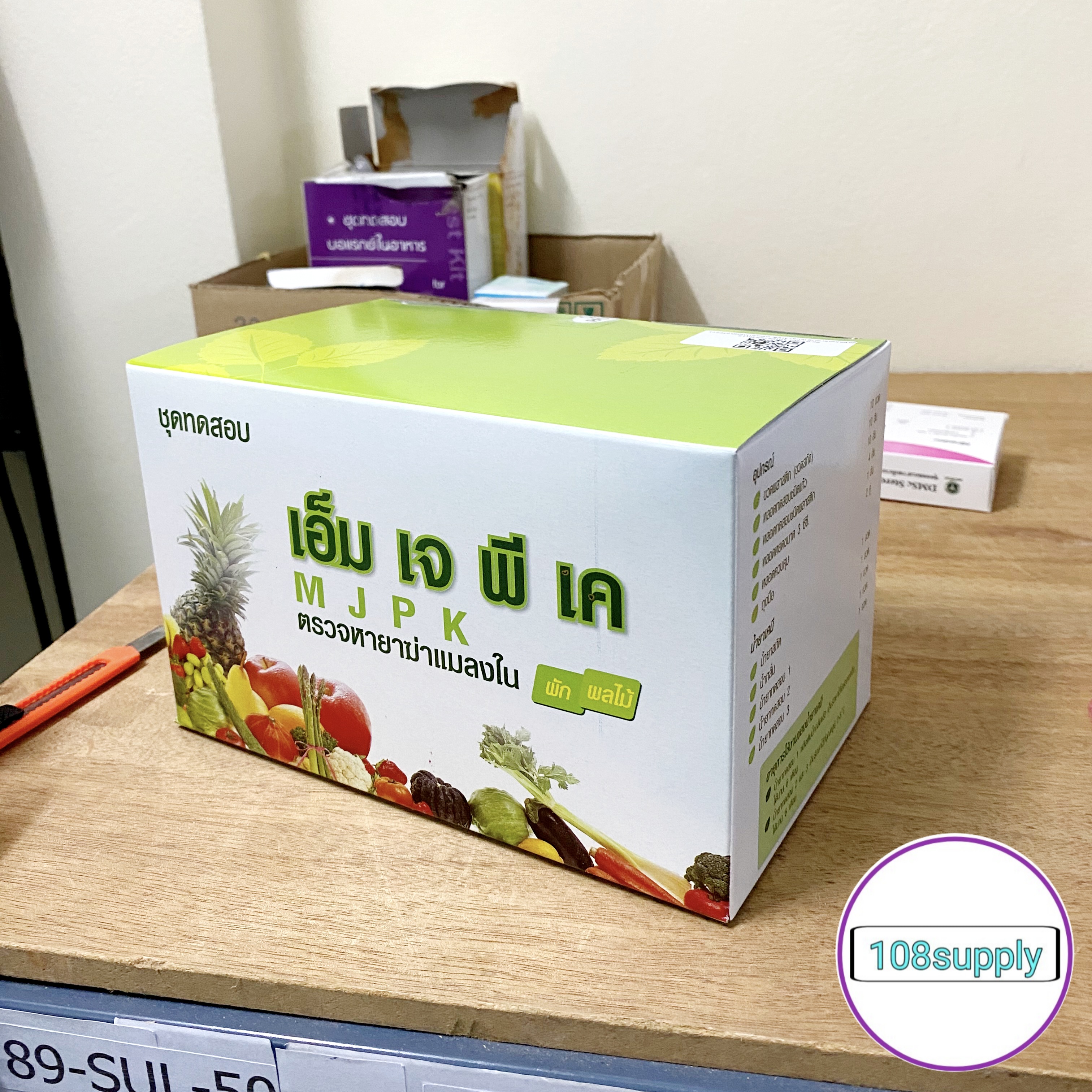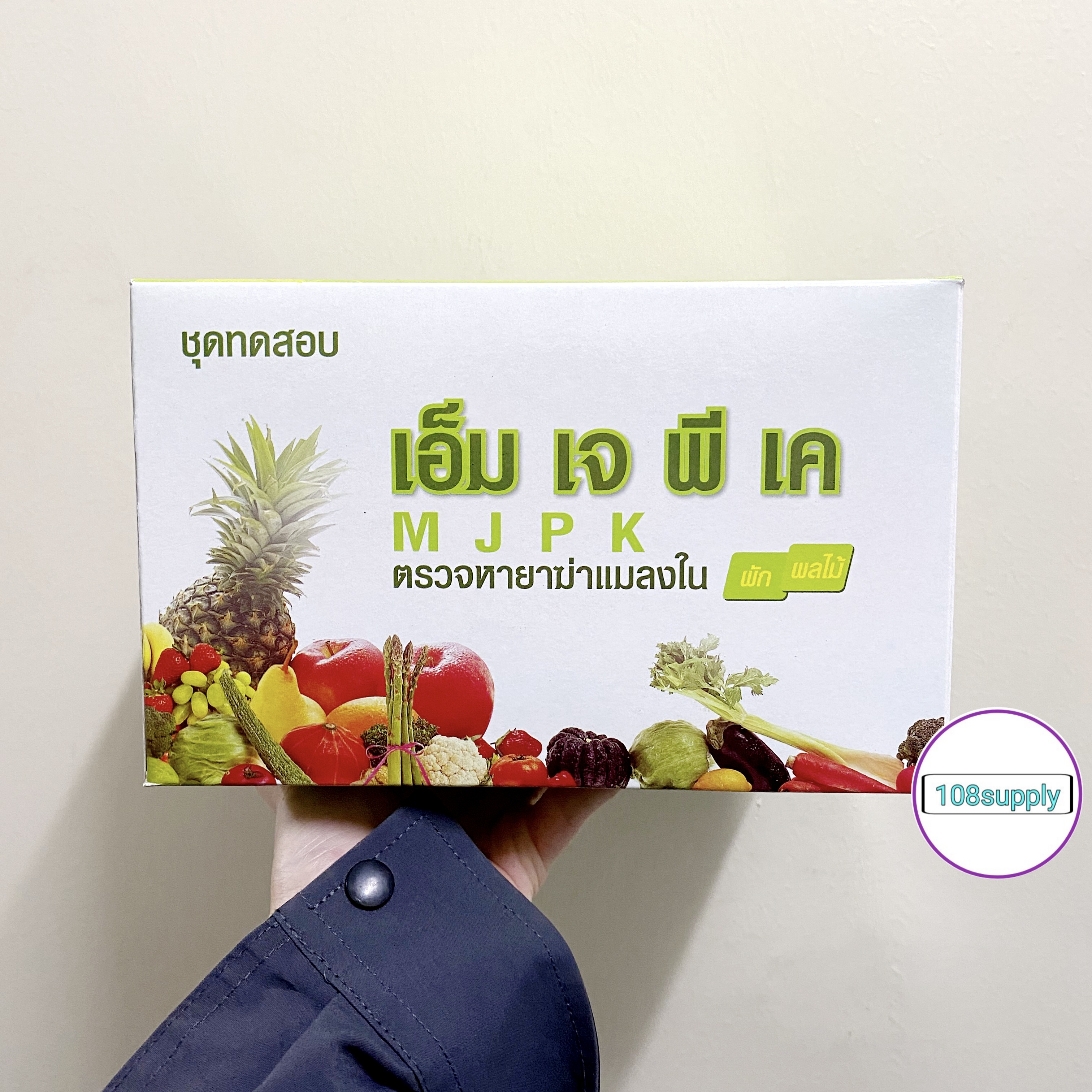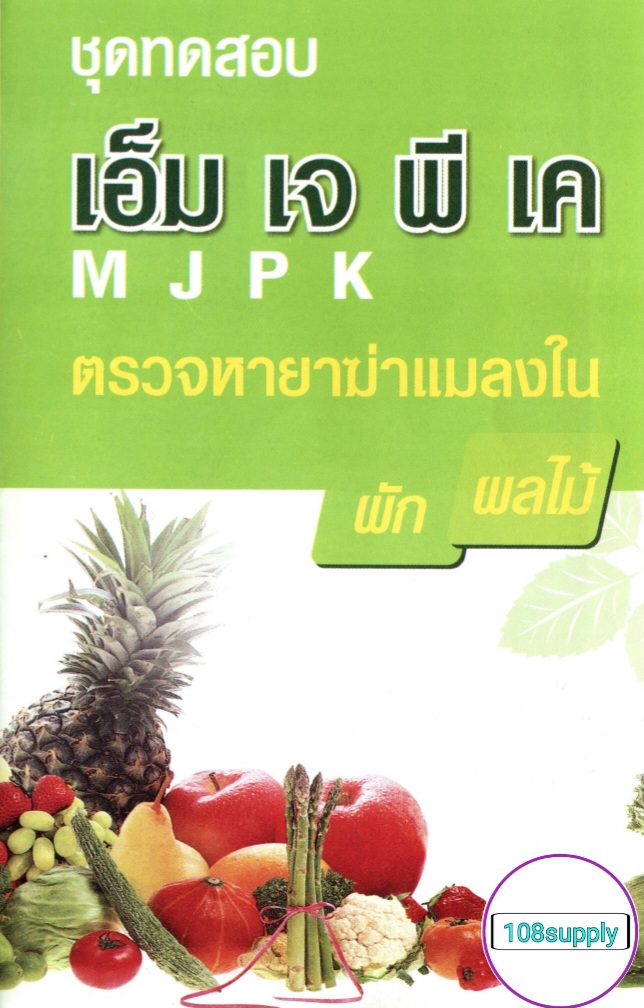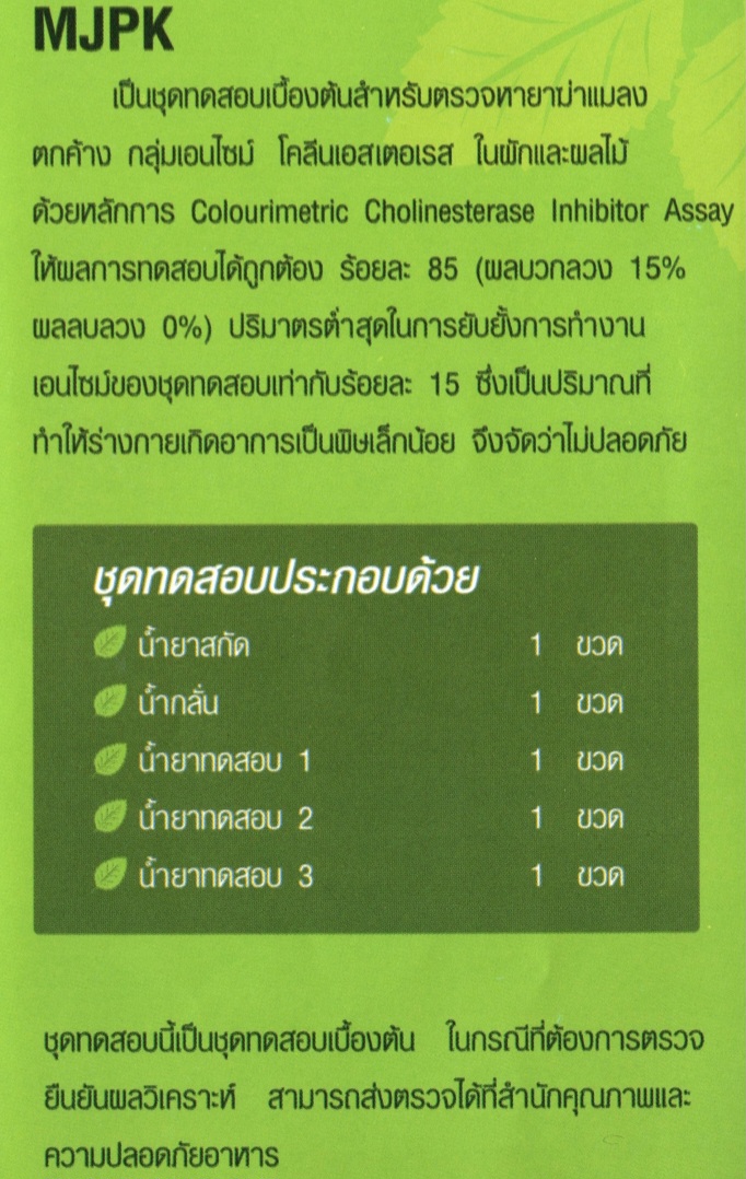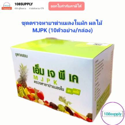 www.108-supply.com line@244cnuqk ชุดทดสอบหายาฆ่าแมลงในผักผลไม้ MJPK (กลุ่มฟอสเฟต,คาร์บาเมต) (MJPK Test Kit for Screening Pesticide Residues in Vegetable and Fruits) การดูแลคุณภาพอาหารด้วยตนเอง เป็นชุดทดสอบเบื้องต้นสำหรับตรวจหายาฆ่าแมลงตกค้างกลุ่มยับยั้งเอนไซม์โคลีนเอสเตอร์เรส (กลุ่มยาฆ่าแมลงออร์กาโนฟอสเฟตและคาร์บาเมท) ในผักและผลไม้ ด้วยหลักการ Colorimetric cholinesterase inhibitor assay ให้ผลการทดสอบได้ถูกต้องร้อยละ 85 (ผลบวกลวงร้อยละ 15 ผลลบลวงร้อยละ 0) ความไวร้อยละ 100 ปริมาณต่ำสุดในการยับยั้งการทำงานของเอนไซม์ของชุดทดสอบเท่ากับ 15% ซึ่งเป็นปริมาณที่ทำให้ร่างกายเกิดอาการพิษเล็กน้อยจัดว่าไม่ปลอดภัย ผลกระทบต่อสุขภาพ หากบริโภคผักผลไม้ที่มียาฆ่าแมลงตกค้างกลุ่มยับยั้งเอนไซม์โคลีนเอสเตอเรส สูงเกินค่าที่ปลอดภัย อาจเกิดอาการดังนี้ - กล้ามเนื้อกระตุก โดยเฉพาะที่ลิ้น ใบหน้าและลำคอ หรือทั่วร่างกาย อ่อนเพลีย เป็นอัมพาต และอาจเสียชีวิตได้ - คลื่นไส้ อาเจียน เหงื่อออก แน่นหน้าอก หรือถ้าอาการรุนแรงขึ้นอาจปวดท้อง ท้องเดิน น้ำลายฟูมปาก น้ำตาและน้ำมูกไหล ถ่ายอุจจาระและปัสสาวะโดยกลั้นไม่อยู่ หลอดลมมีเสมหะมาก หายใจหอบ หลอดลมตีบ หน้าเขียวคล้ำ เป็นต้น - ปวดศีรษะ มึนงง อาจชักหมดสติได้ ประโยชน์ของชุดทดสอบ ใช้ตรวจสอบเบื้องต้นสำหรับตรวจหายาฆ่าแมลงตกค้างกลุ่มยับยั้งเอนไซม์โคลีนเอสเตอร์เรส (กลุ่มยาฆ่าแมลงออร์กาโนฟอสเฟตและคาร์บาเมท) ในผักและผลไม้ ตัวอย่างเป้าหมาย - ผักและผลไม้ทุกชนิด อายุการใช้งานชุดทดสอบ 6 เดือนนับจากวันผลิต จำนวนตัวอย่างที่ชุดทดสอบตรวจได้ 10 TEST/BOX ชุดทดสอบประกอบด้วย กล่องอุปกรณ์ น้ำยาสกัด 1 ขวด น้ำกลั่น 1 ขวด ขวดพลาสติก 10 ขวด หลอดแก้ว 10 อัน หลอดพลาสติก 10 อัน หลอดหยดขนาด 3 ซีซี 1 อัน หลอดควบคุม 1 อัน ถุงมือ 2 คู่ คู่มือการใช้งาน1 แผ่น น้ำยาทดสอบ น้ำยาทดสอบ 1 (แช่เย็น)1 ขวด น้ำยาทดสอบ 2 (แช่เย็น)1 ขวด น้ำยาทดสอบ 3 (แช่เย็น)1 ขวด *น้ำยาทดสอบต้องแช่เย็น 4-8 องศาเซลเซียส