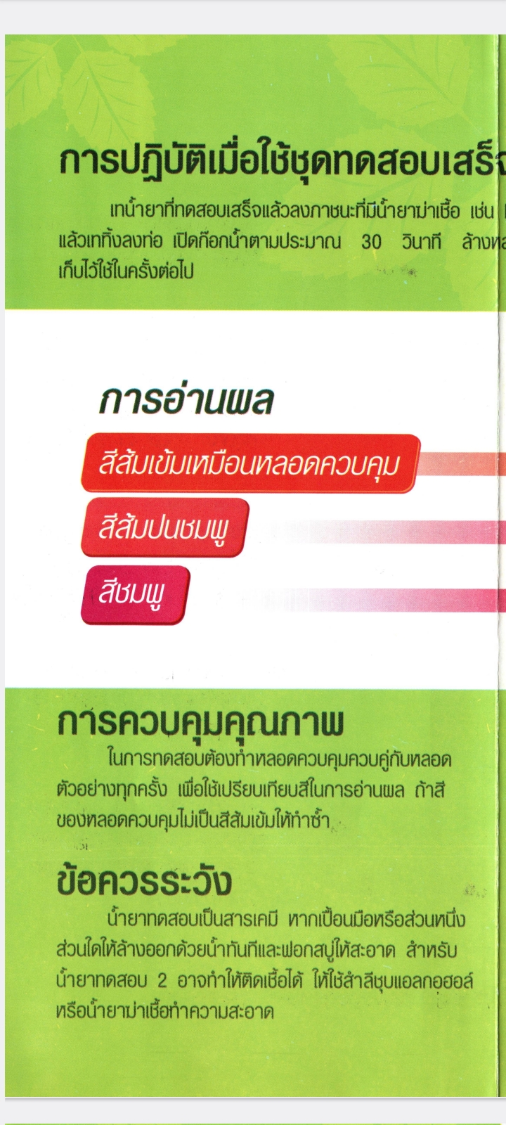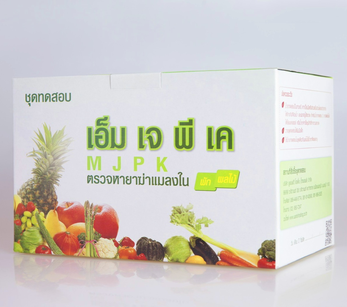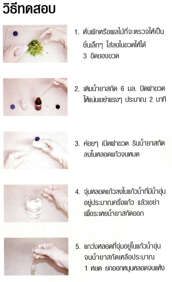 www.108-supply.com line@244cnuqk ชุดทดสอบหายาฆ่าแมลงในผักผลไม้ MJPK (กลุ่มฟอสเฟต,คาร์บาเมต) (MJPK Test Kit for Screening Pesticide Residues in Vegetable and Fruits) การดูแลคุณภาพอาหารด้วยตนเอง เป็นชุดทดสอบเบื้องต้นสำหรับตรวจหายาฆ่าแมลงตกค้างกลุ่มยับยั้งเอนไซม์โคลีนเอสเตอร์เรส (กลุ่มยาฆ่าแมลงออร์กาโนฟอสเฟตและคาร์บาเมท) ในผักและผลไม้ ด้วยหลักการ Colorimetric cholinesterase inhibitor assay ให้ผลการทดสอบได้ถูกต้องร้อยละ 85 (ผลบวกลวงร้อยละ 15 ผลลบลวงร้อยละ 0) ความไวร้อยละ 100 ปริมาณต่ำสุดในการยับยั้งการทำงานของเอนไซม์ของชุดทดสอบเท่ากับ 15% ซึ่งเป็นปริมาณที่ทำให้ร่างกายเกิดอาการพิษเล็กน้อยจัดว่าไม่ปลอดภัย ผลกระทบต่อสุขภาพ หากบริโภคผักผลไม้ที่มียาฆ่าแมลงตกค้างกลุ่มยับยั้งเอนไซม์โคลีนเอสเตอเรส สูงเกินค่าที่ปลอดภัย อาจเกิดอาการดังนี้ - กล้ามเนื้อกระตุก โดยเฉพาะที่ลิ้น ใบหน้าและลำคอ หรือทั่วร่างกาย อ่อนเพลีย เป็นอัมพาต และอาจเสียชีวิตได้ - คลื่นไส้ อาเจียน เหงื่อออก แน่นหน้าอก หรือถ้าอาการรุนแรงขึ้นอาจปวดท้อง ท้องเดิน น้ำลายฟูมปาก น้ำตาและน้ำมูกไหล ถ่ายอุจจาระและปัสสาวะโดยกลั้นไม่อยู่ หลอดลมมีเสมหะมาก หายใจหอบ หลอดลมตีบ หน้าเขียวคล้ำ เป็นต้น - ปวดศีรษะ มึนงง อาจชักหมดสติได้ ประโยชน์ของชุดทดสอบ ใช้ตรวจสอบเบื้องต้นสำหรับตรวจหายาฆ่าแมลงตกค้างกลุ่มยับยั้งเอนไซม์โคลีนเอสเตอร์เรส (กลุ่มยาฆ่าแมลงออร์กาโนฟอสเฟตและคาร์บาเมท) ในผักและผลไม้ ตัวอย่างเป้าหมาย - ผักและผลไม้ทุกชนิด อายุการใช้งานชุดทดสอบ 6 เดือนนับจากวันผลิต จำนวนตัวอย่างที่ชุดทดสอบตรวจได้ 10 TEST/BOX ชุดทดสอบประกอบด้วย กล่องอุปกรณ์ น้ำยาสกัด 1 ขวด น้ำกลั่น 1 ขวด ขวดพลาสติก 10 ขวด หลอดแก้ว 10 อัน หลอดพลาสติก 10 อัน หลอดหยดขนาด 3 ซีซี 1 อัน หลอดควบคุม 1 อัน ถุงมือ 2 คู่ คู่มือการใช้งาน1 แผ่น น้ำยาทดสอบ น้ำยาทดสอบ 1 (แช่เย็น)1 ขวด น้ำยาทดสอบ 2 (แช่เย็น)1 ขวด น้ำยาทดสอบ 3 (แช่เย็น)1 ขวด *น้ำยาทดสอบต้องแช่เย็น 4-8 องศาเซลเซียส